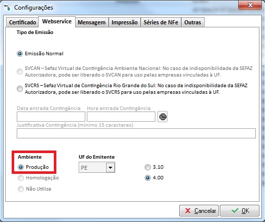 Na aba Webservice deve ser selecionado o ambiente de Produção.