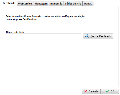 Nesta aba, clique em Buscar Certificado para selecionar o certificado digital que a empresa utilizará para a emissão de Notas Fiscais Eletrônicas, (é necessário que o certificado digital já esteja instalado no computador, lembrando que os modelos compatíveis são: A1 e A3).