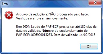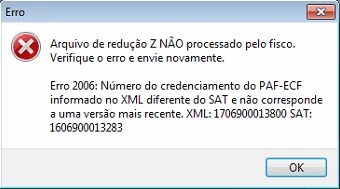 "Número do credenciamento do PAF-ECF informado no XML diferente do SAT e não corresponde a uma versão mais recente" ou "Laudo do PAF-ECF precisa ser até 180 dias da data de validade"