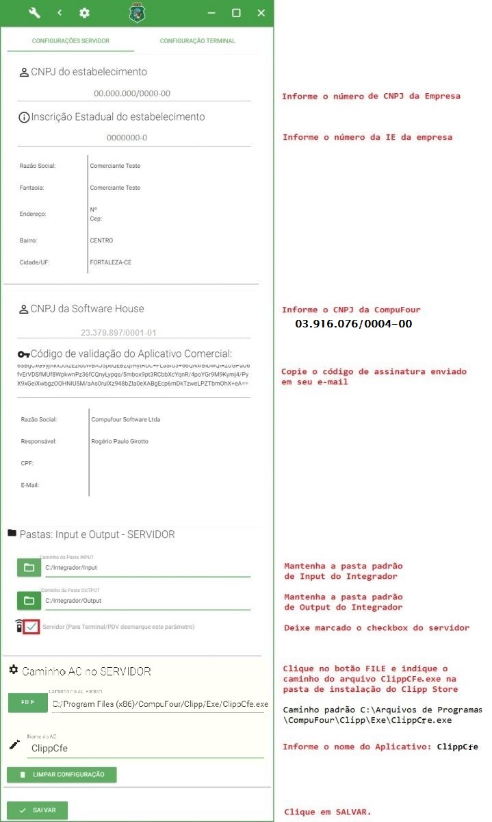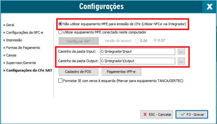 Marque a opção Não utilizar equipamento MFE para emissão de CFe (Utilizar via Integrador) e defina os mesmos caminhos da imagem nos campos de Input e Output.
