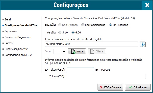 e selecione o seu Certificado Digital. Deverá também clicar no botão Nova definir a Série pela qual irá emitir os documentos, além de obter com a contabilidade o ID. Token (CSC) e o Token (CSC).