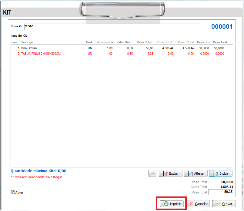 É possível também Imprimir o KIT para visualização, basta clicar no botão Imprimir;
