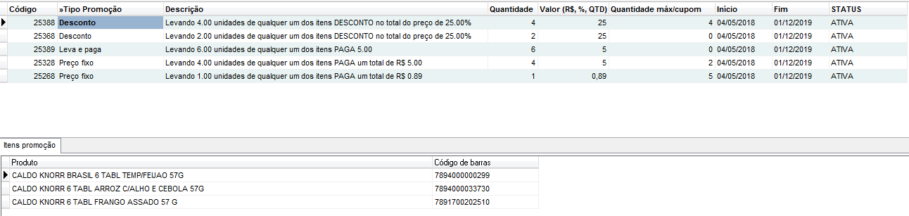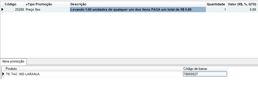 Apresentará todas as promoções vinculadas. Clicando sobre cada uma, no rodapé apresentará os itens vinculados a promoção. Caso não possua cadastrado no estoque, poderá clicar três vezes sobre o código de barras e cadastrar no produto referente a essa promoção, diretamente no estoque.