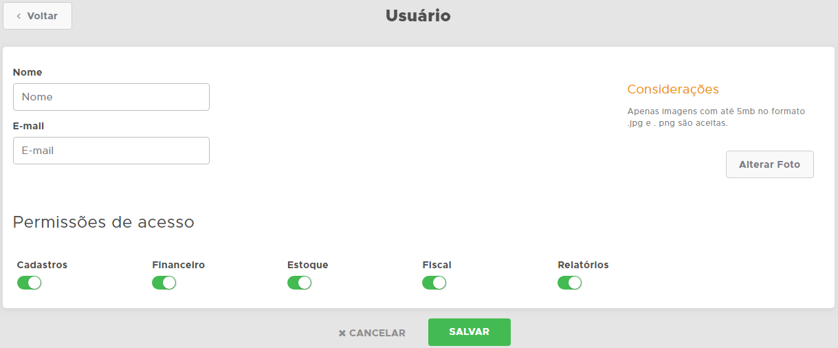 Agora é necessário informar o nome do usuário, e-mail (utilizado para acessar o sistema), é possível escolher a foto do usuário e também as permissões, ou seja, os módulos que o usuário poderá ter acesso.