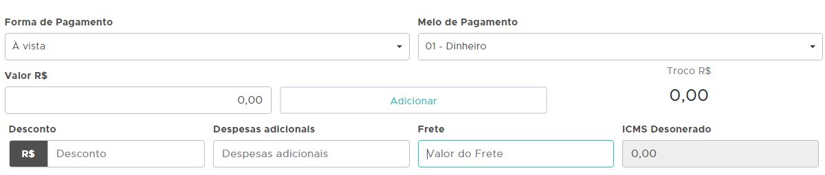 Além da forma de pagamento, é possível aplicar o desconto no total do documento, despesas adicionais e Frete;