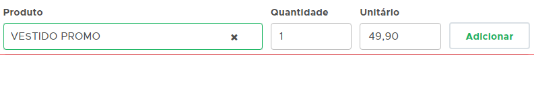 O primeiro passo é escolher o produto que deseja vender, poderá digitar a descrição, referência, código de barras ou o código do mesmo. Após escolher a mercadoria, quantidade e valor, clique no botão Adicionar.