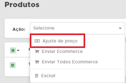 Ao selecionar os itens que deseja e clicar na Ação, você poderá realizar o ajuste de preço: