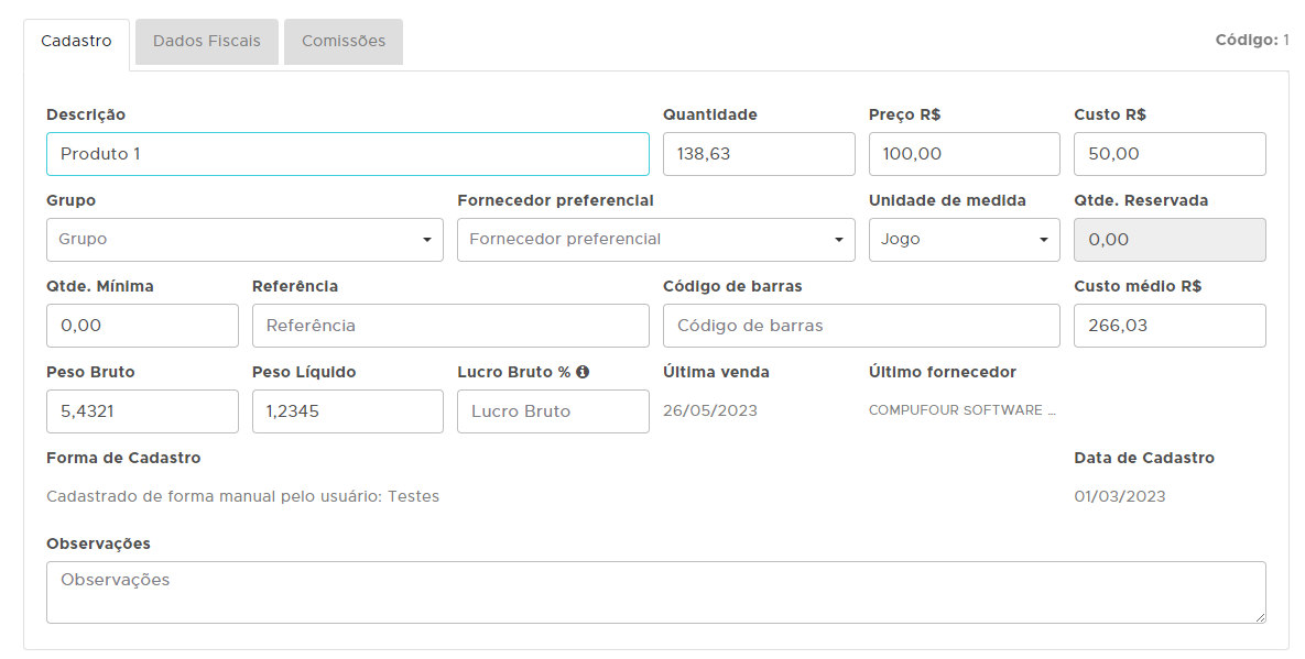 Na primeira aba, a de cadastro, conterá os dados básicos da mercadoria, serão disponibilizados os seguintes campos: