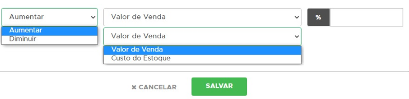 Em seguida, escolha se deseja aumentar ou diminuir o preço de venda ou custo do estoque, ao lado, preencha o percentual desse aumento/redução;