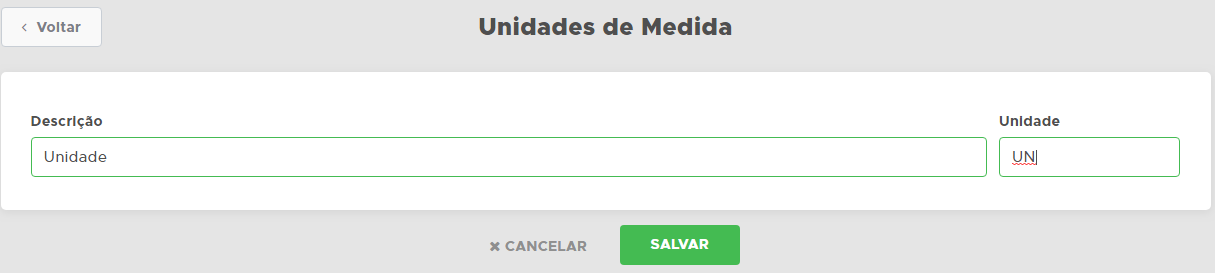 Abrirá a tela de cadastro da unidade de medida, preencha a Descrição e também o Código da Unidade de medida.