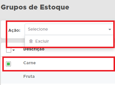 Para excluir um grupo já cadastrado, marque o Checkbox e escolha a ação Excluir.