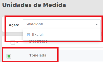 Para realizar a exclusão de unidade de medida, clique sobre ela e em seguida, na ação, escolha Excluir.