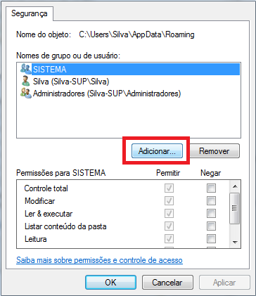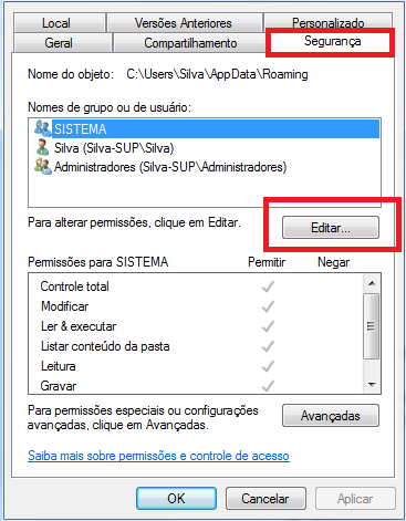 Nas propriedades, clique na aba Segurança e em seguida clique em Editar.