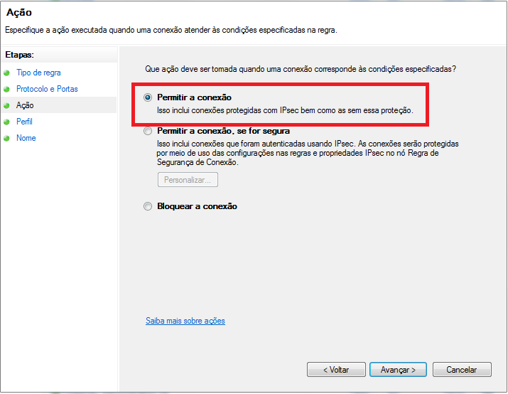 Marque a opção Permitir a Conexão e clique em Avançar.