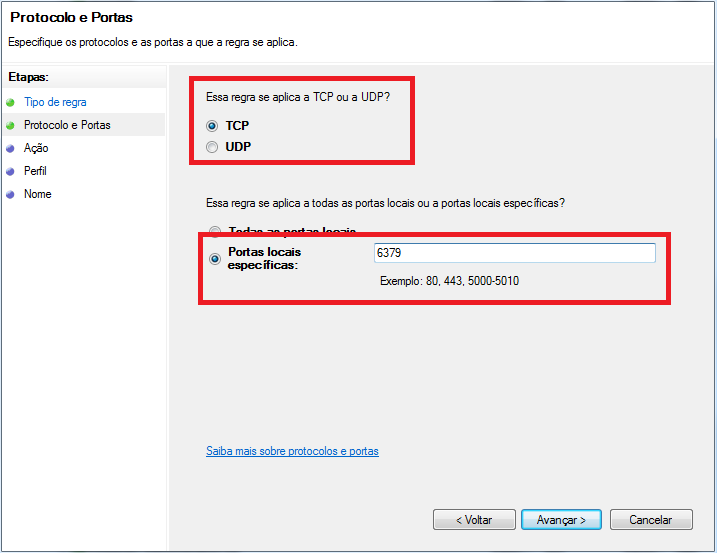 Você deverá definir a regra para TCP e UDP, grave uma e depois repita o processo para a outra. É necessário configurar a Porta 6379.