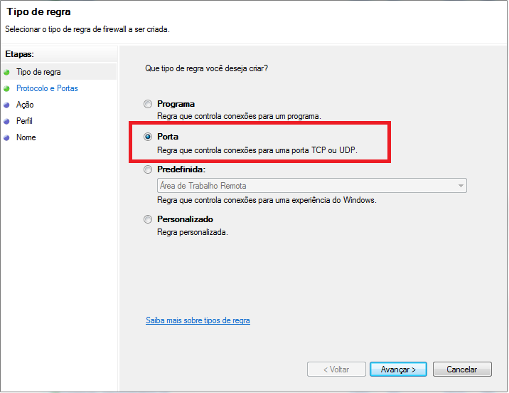 Escolha a opção Porta e clique em Avançar.