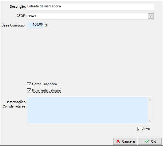 Informações Complementares: Poderá cadastrar uma mensagem padrão do CFOP, cada documento de entrada emitido irá contar com essa informação automaticamente nas Informações Complementares Editáveis.