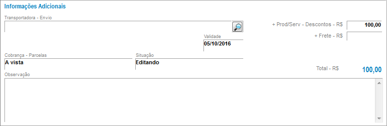 - Informações Adicionais: será possível definir antecipadamente qual Transportadora fará a entrega da mercadoria, bem como informar o Valor do frete. Também será possível definir a Validade deste pedido e os Parcelamentos que poderão ser utilizados na importação do pedido para a nota ou cupom. Por fim, podem ser adicionadas Observações para o pedido.