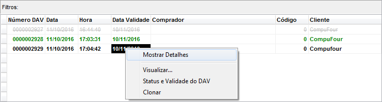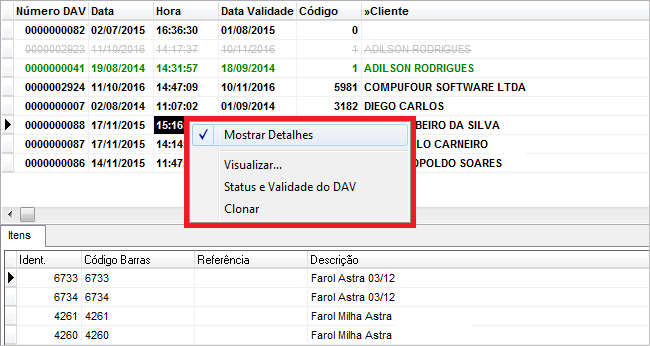 – Mostrar detalhes: Esta opção mostra as principais informações da DAV no rodapé da janela.