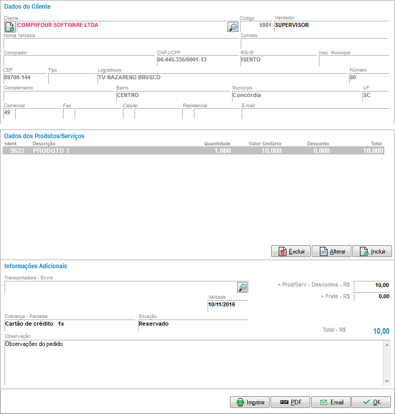 Para gravar o pedido, clique em OK. Também é possível realizar a impressão do mesmo, gerá-lo em PDF ou enviar por e-mail.