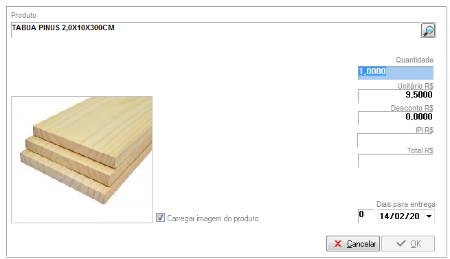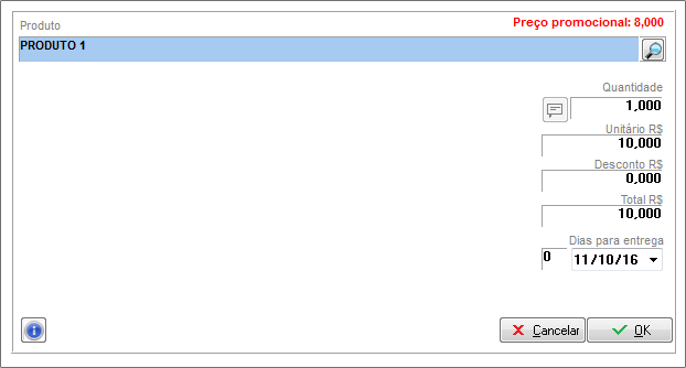 Após selecionar o produto, basta informar sua quantidade, valor unitário e desconto, quando houver, e clicar em OK.