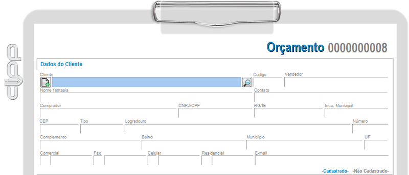 - Dados do Cliente: primeiramente será necessário informar o Cliente. Poderá optar por lançar o orçamento com o nome de um cliente ainda não cadastrado no sistema. Para isso, basta clicar na opção -Não Cadastrado- e prosseguir com o lançamento.