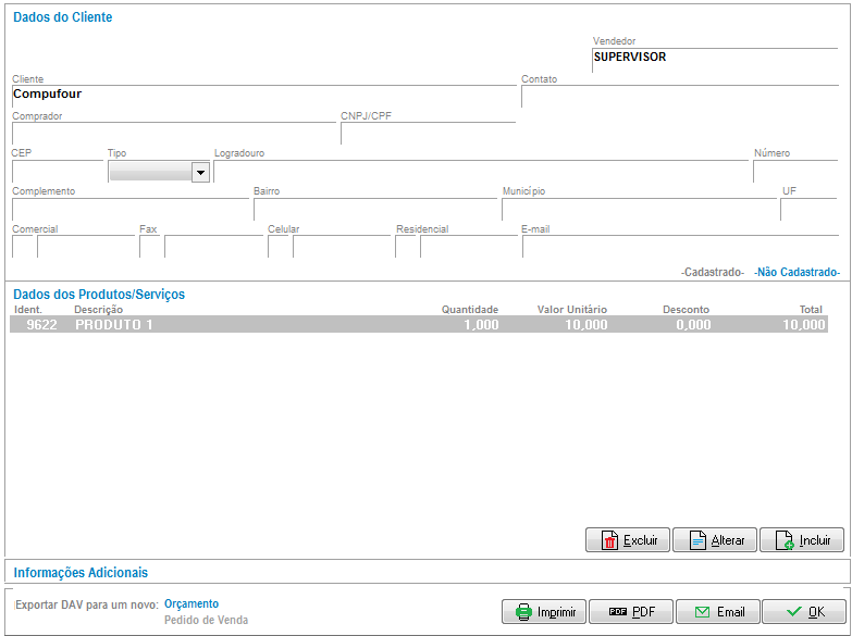 Para gravar o orçamento, clique em OK. Também é possível realizar a impressão do mesmo, gerá-lo em PDF ou enviar por e-mail.
