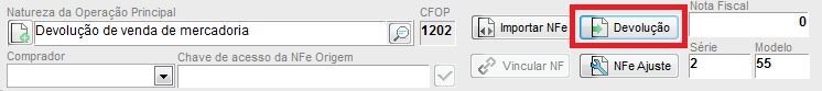 Em seguida, informe o número da nota como 0, série que utiliza e modelo 55, e também a natureza de operação de devolução;