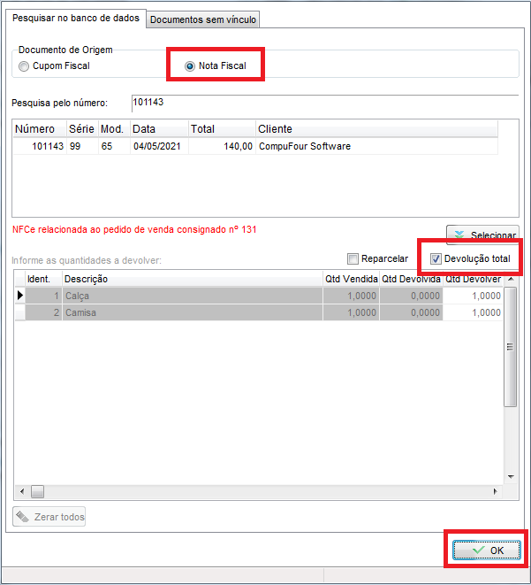Marque a opção Nota Fiscal e informa o número da NFC-e a ser devolvida, deixe marcada a opção Devolução Total e clique em OK;