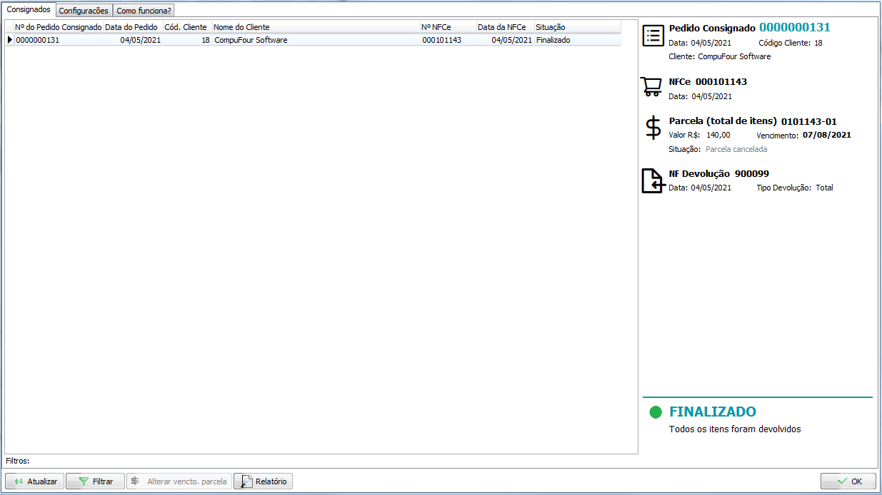 Para verificar o pedido de venda lançado, abra Compras/Vendas - Consignado;