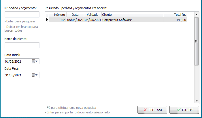 Em seguida, escolha o pedido consignado lançado previamente e pressione F3 - OK;