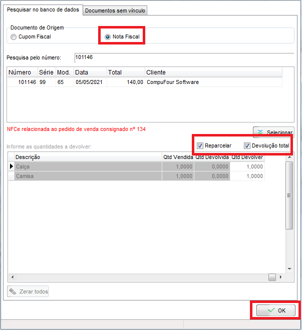 Marque a opção Nota Fiscal e informa o número da NFC-e a ser devolvida, marque as opções Reparcelar Devolução Total;