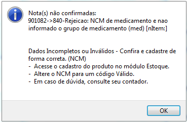 Dados Incompletos ou Inválidos - Confira e cadastre de forma correta. (NCM) - Acesse o cadastro do produto no módulo Estoque. - Altere o NCM para um código Válido. - Em caso de dúvida, consulte seu contador.
