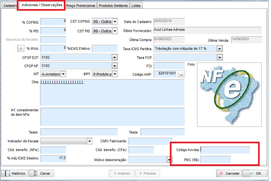 Em seguida, abra o cadastro do item, clique na aba adicionais/observações e preencha o Código Anvisa e PMC R$ (Preço máximo ao consumidor, que é o preço máximo pelo qual as farmácias e drogarias podem praticar ao vender para o consumidor.)