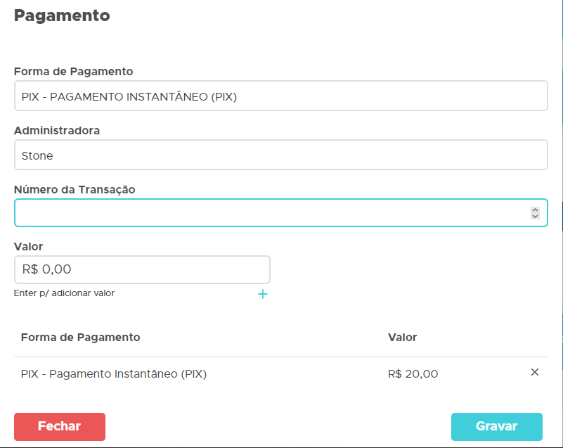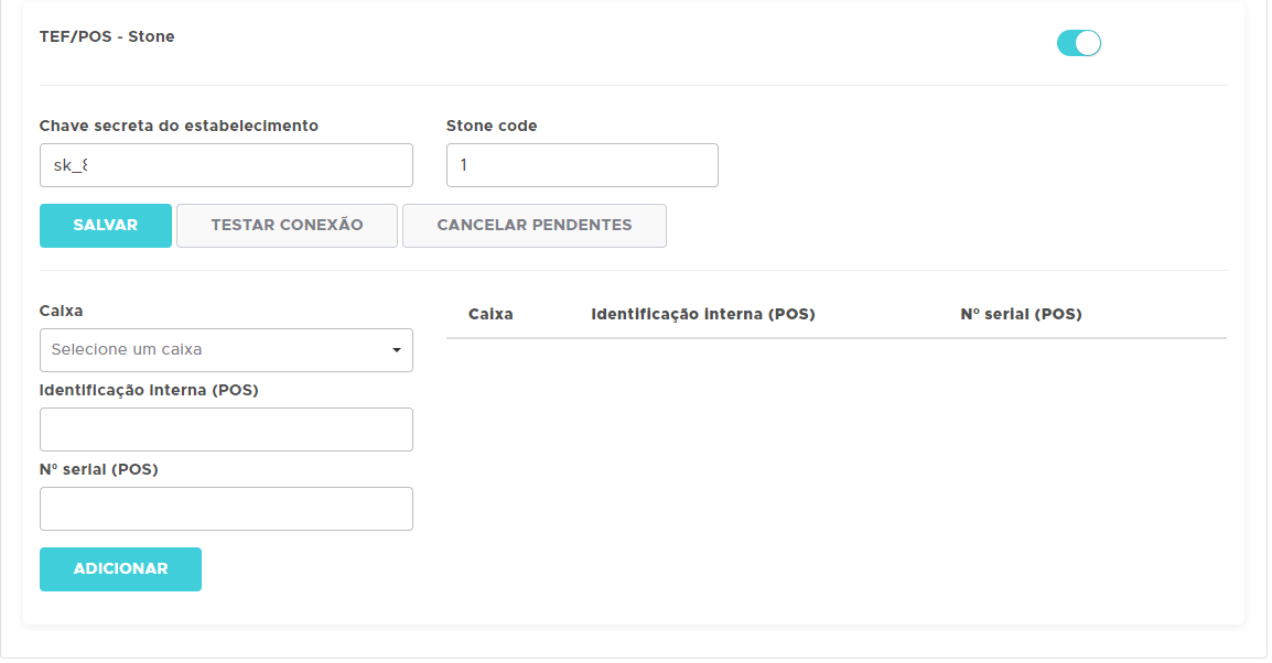 Para o preenchimento desses campos, todos os dados devem ser verificados com a Stone. Os dados de Caixa, Identificação interna e Nº Serial não são obrigatórios. Mas se não forem preenchidos e tiver mais de uma máquina Stone no estabelecimento, irá enviar para a primeira máquina disponível, caso deseje enviar a venda de um caixa para uma maquininha específica deve preencher tais dados.