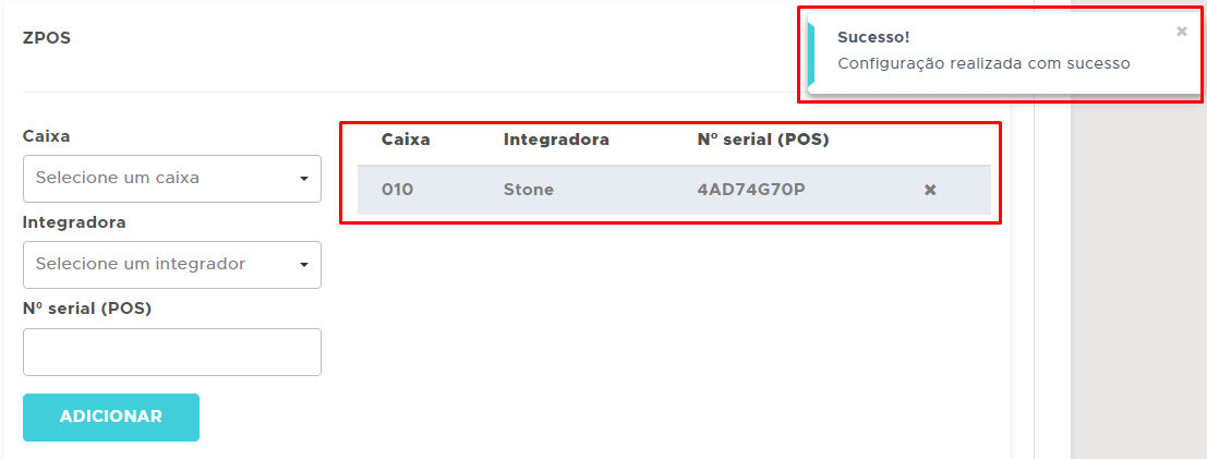 Primeiro será necessário informar o caixa no qual ficará a maquininha, no campo Integradora selecione a opção Stone e por fim informar o Número do Serial da maquininha da Stone no campo Nº Serial (POS). Após isso basta clicar em Adicionar.