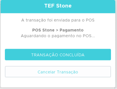 Após clicar em POS integrado Stone será apresentado a seguinte tela, onde o usuário pode cancelar a transação ou clicar em transação concluída.