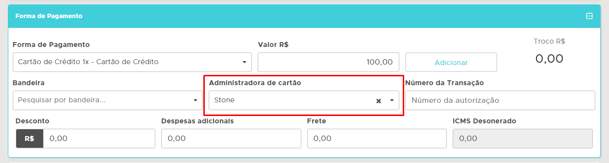 Ao finalizar uma venda tanto no NFC-e, PDV, Gerencial ou no PDV Gerencial, você deverá selecionar a forma de pagamento que tenha o meio de pagamento crédito ou débito e no campo Administradora de Cartão, selecione a Stone.