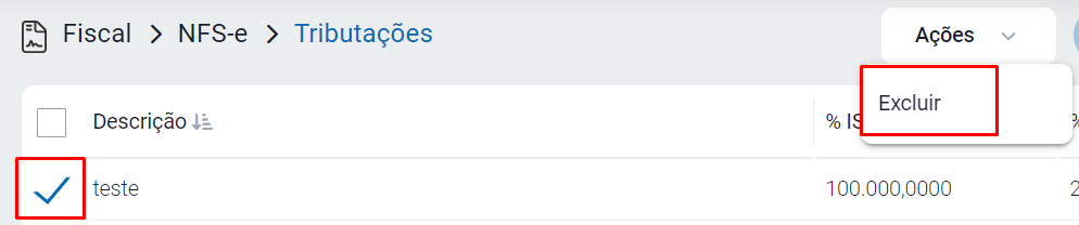 Após concluir o cadastro, clique no botão Salvar. Caso queira excluir a tributação, marque o checkbox, clique em ação - excluir.