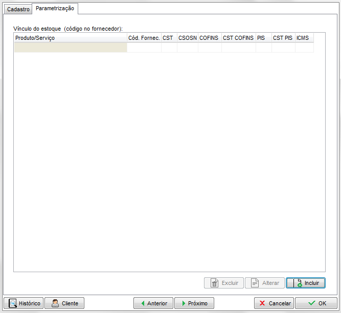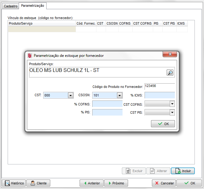 Para parametrizar um produto do seu estoque clique sobre o botão Incluir e preencha as informações do produto que já deve estar cadastrado.