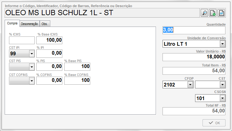 Para verificar o produto parametrizado efetue dois cliques sobre o item desejado no corpo da nota e confira as informações conforme imagem a seguir: