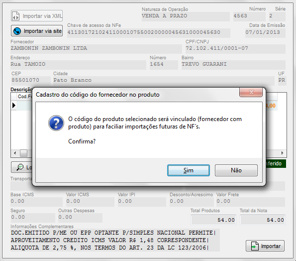 Após clicar sobre esse botão será apresentada uma janela confirmando a parametrização, clique em Sim e seu produto será parametrizado conforme informações contidas no xml em questão.