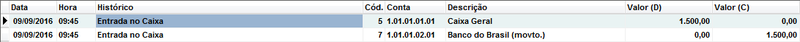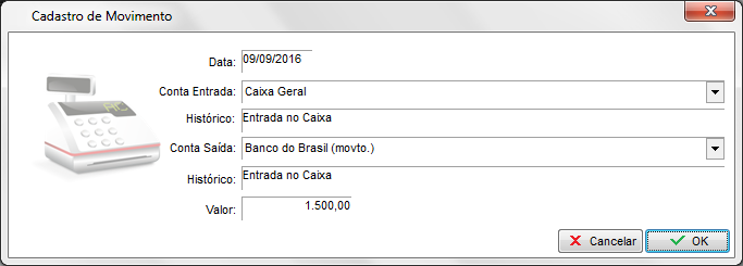 Ao lançar essas informações, uma movimentação será criada, seguindo os modelos contábeis de Crédito e Débito, ou seja, um Débito na conta selecionada em Conta Entrada, e um Crédito para a conta selecionada em Conta Saída, ambas com o mesmo valor: