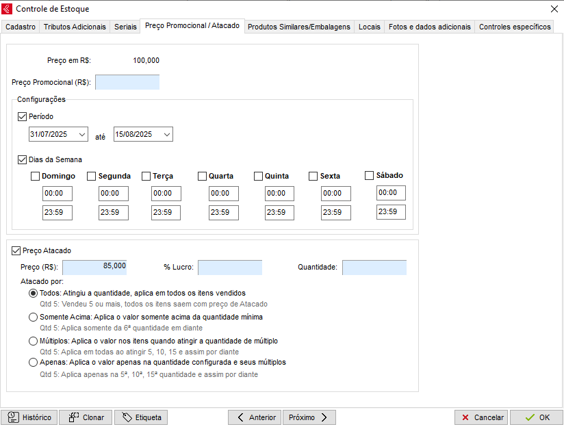 A aba Preço Promocional / Atacado permite que seja informado um novo preço do produto por determinado período, sempre que o mesmo estiver preenchido, o valor utilizado para vendas será o preço promocional. Também é possível determinar por quanto tempo esse preço será válido. Para mais informações clique aqui. E para Preço em Atacado clique aqui.