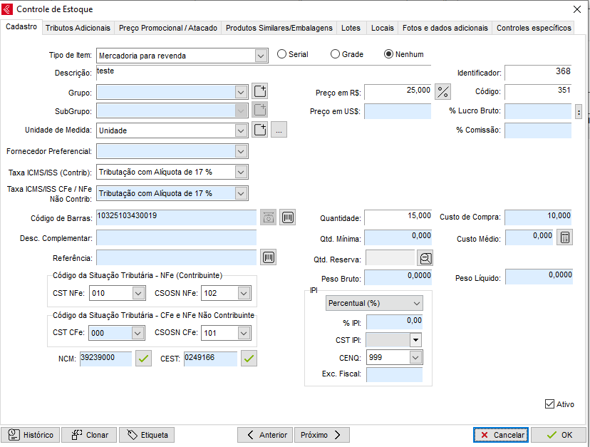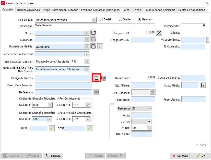 Ativo: Desmarcando esta Opção o produto ficará inativo no estoque, ou seja, não será possível utilizá-lo em vendas, compras, relatórios entre outras operações.