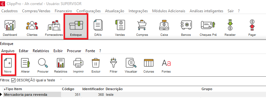 No módulo de Estoque, poderá cadastrar um novo item acessando o menu Editar e clicando em Novo ou diretamente através do botão Novo.