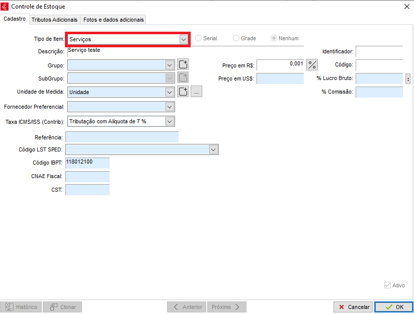 Veja que quando o tipo do item for Serviço, serão habilitados dois campos novos que são específicos para serviço. São eles: