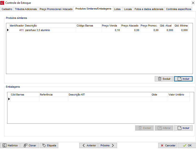 A aba Produtos Similares permite que sejam listados os itens paralelos ou como o próprio nome diz: Similares. Por exemplo, um cartucho de impressora é encontrado tanto original quanto em sua forma paralela no mercado. Da mesma forma em autopeças, onde existe a peça original de fábrica, mas também uma peça paralela de mercado. Para saber mais sobre Embalagens, clique aqui.