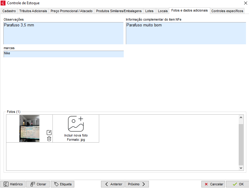 Na aba Guia Fotos e Dados Adicionais é possível informar as observações que desejar no item, informação complementar. Também é possível incluir a foto de identificação do produto, sendo pertidio no máximo 6 fotos.