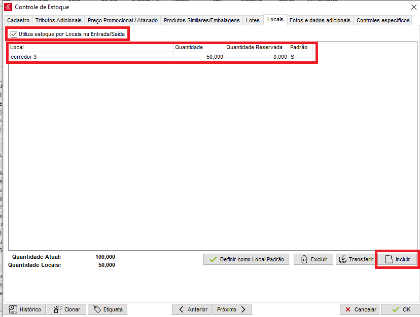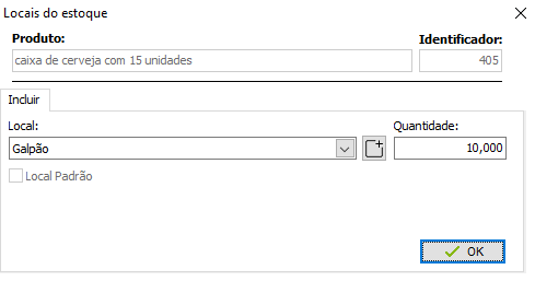 Marcando a opção Utiliza Estoque por Locais na Entrada/Saída, a opção de Incluir ficará disponível. Então você poderá incluir um local para o Item e a Quantidade alocada no Local selecionado como no exemplo a baixo:
